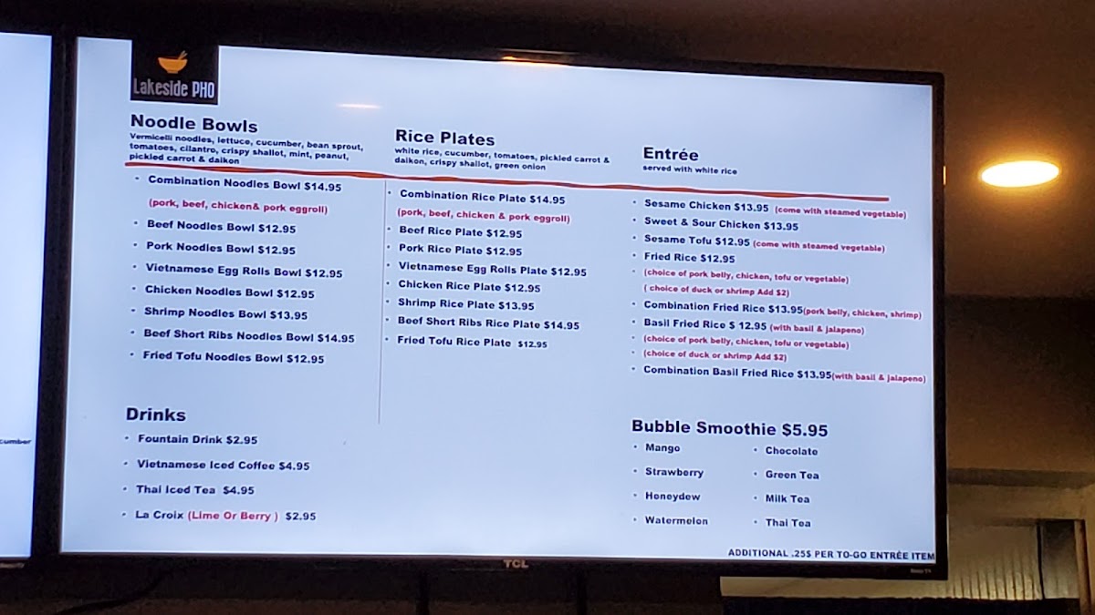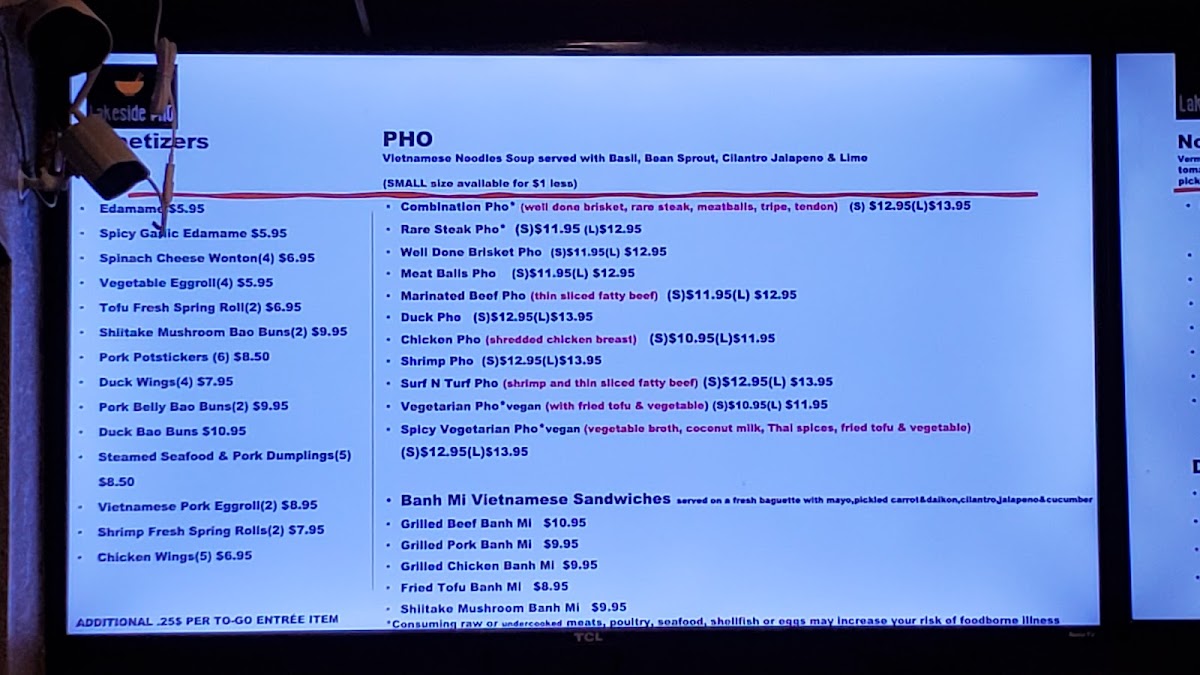 Overall, Lakeside Pho’s menu is a delightful journey through a variety of textures, flavors, and aromas that cater to all tastes. Whether you're in the mood for pho, bao, spring rolls, or a sandwich, there’s something here for everyone to enjoy.